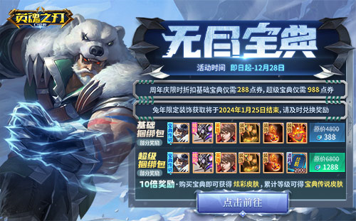 12月29日-1月25日,即可在无尽宝典中获取【熊猫武僧-冬熊战士】,周年庆期间更享超值限时折扣,基础宝典立减100点券,仅需288点券!进阶宝典立减300点券,仅需988点券,限时抢购,心动不如行动!