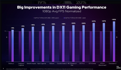 转眼时间来到了8月份,英特尔Game On更是通过累计30多个驱动版本的更新,实现了19%的DX11游戏帧率提升,尤其是《守望先锋2》《DOTA 2》《英雄联盟》等游戏的提升,更是非常明显的,对于A750的用户来讲,能够在2K分辨率下,获得更为流畅丝滑的游戏体验。