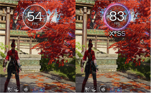 10月19日,国产多人竞技游戏《永劫无间》的DX 12版本正式上线,英特尔锐炫显卡驱动首发支持,并且提供了XeSS超级采样技术支持,在开启XeSS之后,游戏帧数从54提升到了83,游戏帧数实现了50%的提升,更是提供了原生高清4K分辨率画质,游戏画面更为精细。