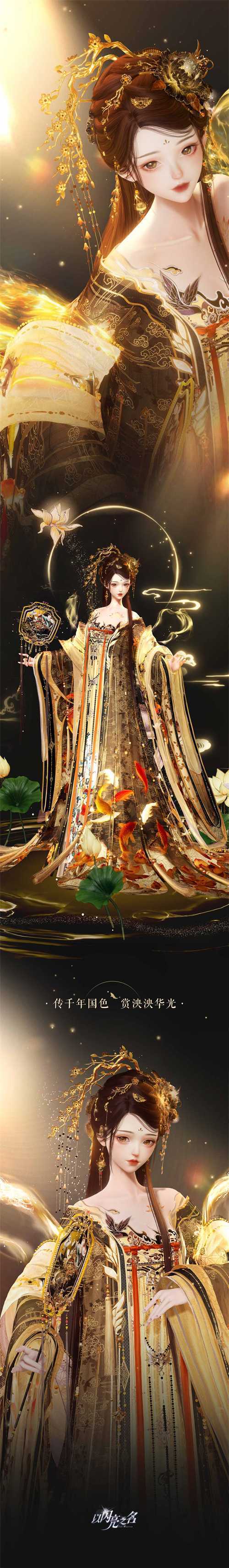 【灵感来源】蜀绣大师孟德芝老师的作品,选用「荷花锦鲤」和「蜀宫乐伎」为主题,展现优雅和繁盛的景象。为了将精美的蜀绣作品一比一还原到衣服上,我们的团队深入研究了非遗技艺,通过三维技术的努力还原刺绣效果,使非遗传承可以体现在游戏中。大家在游戏中不仅可以欣赏到精美的蜀绣作品,还能感受到非遗文化的独特魅力。