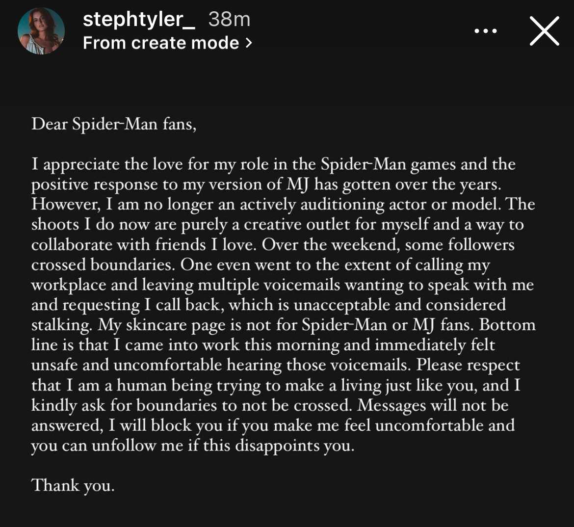 《漫威蜘蛛侠》玛丽简脸模被粉丝骚扰发文谴责越界者(《漫威蜘蛛侠》剧情)