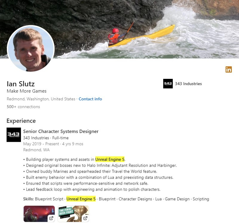 与此同时,现任343高级角色系统设计师Ian Slutz也一直在使用虚幻引擎5,虽然他的领英简介中没有特别提到下一款《光环》游戏,但虚幻引擎5是在2022年4月发布的,比《光环:无限》发布晚了几年,这可能表明343工作室正在开发一些尚未公布的东西。