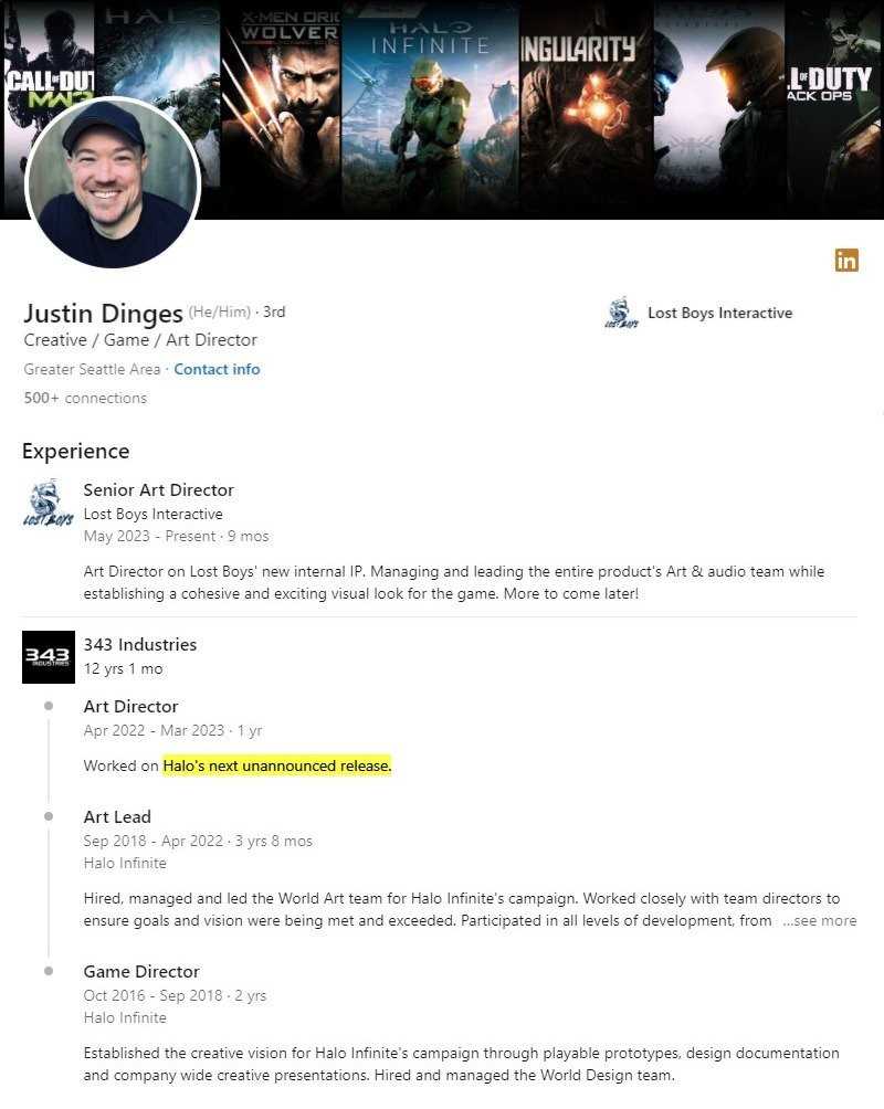 近日有推特用户分享了一些消息,前343艺术总监Justin Dinges在最近更新了他的领英个人资料,根据资料来看,他在2022年4月至2023年3月期间参与了《光环》的下一个项目的开发工作,之后就离开了工作室加入了 Lost Boys Interactive。