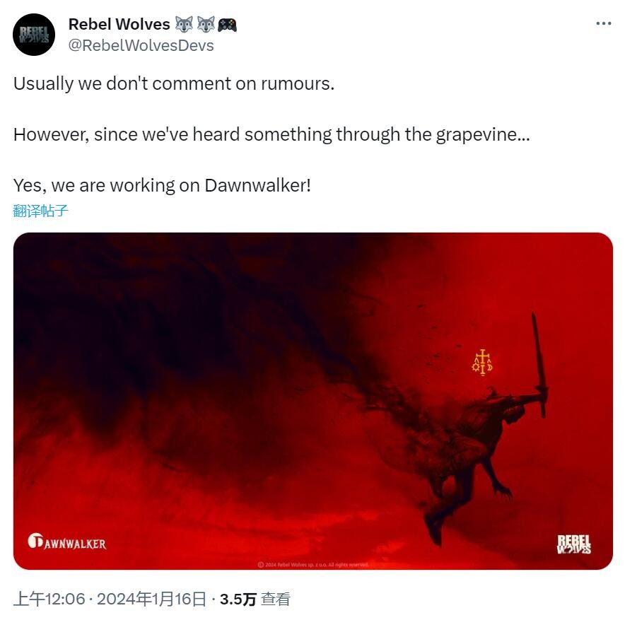 叛狼Rebel Wolves工作室近日公布了正在制作的剧情驱动黑暗奇幻RPG游戏,该作现已正式命名为《黎明行者》(Dawnwalker)。叛狼Rebel Wolves由前CD Projekt RED开发者组成并由网易游戏支持,具体的信息感兴趣的玩家可以了解一下。