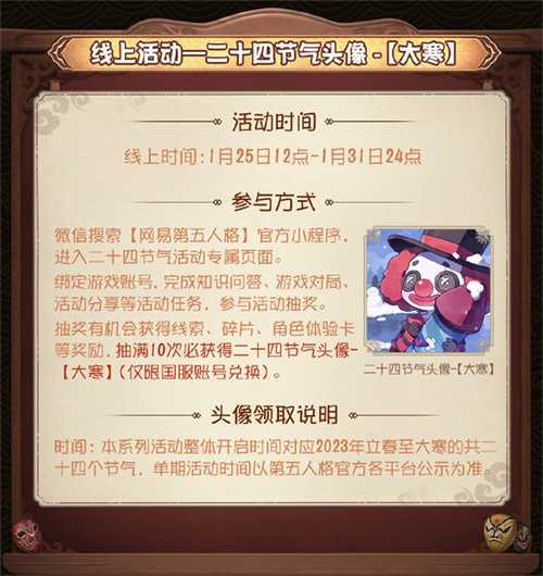此外,大寒节气线上活动将于1月25日12点-1月31日24点开启,届时微信搜索[网易第五人格]官方小程序即可进入二十四节气活动专属页面。绑定游戏账号,完成知识问答、游戏对局、活动分享等活动任务,参与活动抽奖。抽奖有机会获得线索、碎片、角色体验卡等奖励。抽满10次必获得二十四节气头像【大寒】(仅限国服账号兑换),想要头像的访客们千万不要错过。