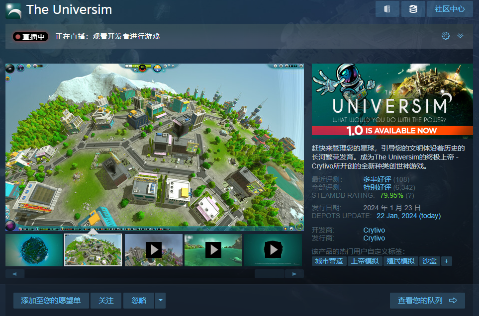 《宇宙主义(The Universim)》是一款城市建造上帝模拟游戏,该作由Crytivo开发和发行,目前已经在Steam商店正式发售,具体的信息感兴趣的玩家可以了解一下。