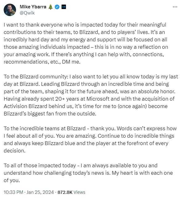 Ybarra发表告别感言:“我要感谢今天受到影响的所有人,感谢他们为自己团队,暴雪和玩家做出的有意义的贡献。这是极其艰难的一天。我想让大家知道,今天是我在暴雪最后一天。我曾带领暴雪度过一段令人难以置信的时光,为未来发展做出了贡献,这是我莫大的荣誉。”