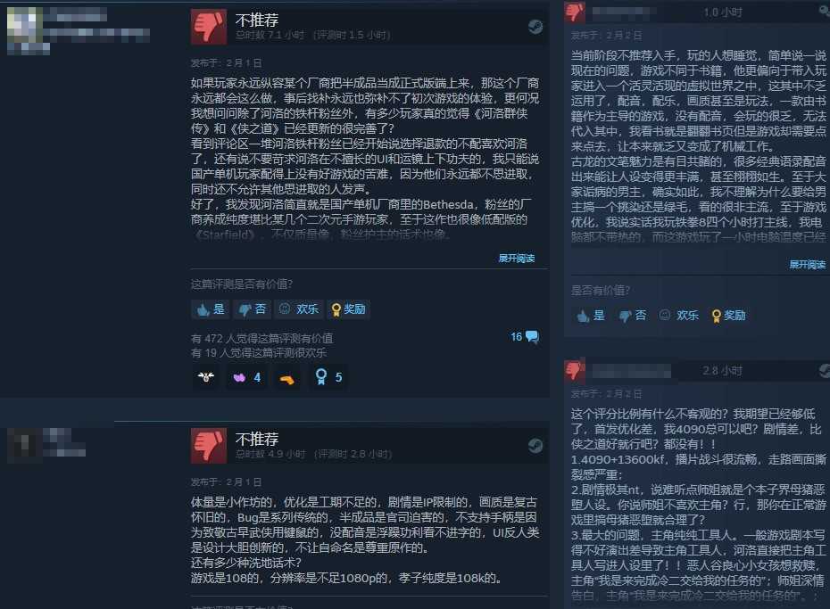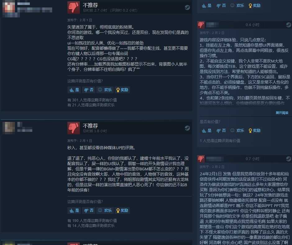 给出差评的玩家则认为《古龙风云录》存在许多问题:优化差画面差、剧情演出僵硬、UI反人类,还不支持手柄等。有人认为河洛工作室固步自封,《古龙风云录》没前几作好玩了。