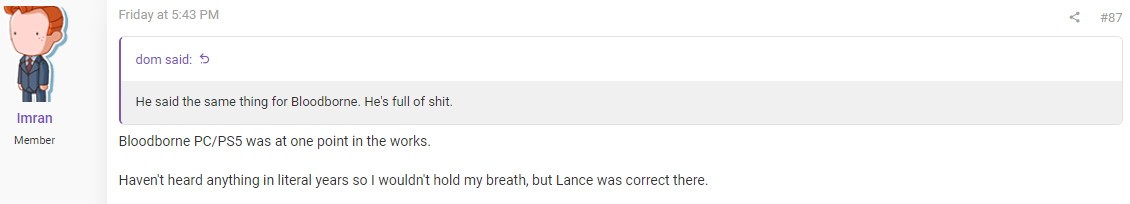随后,前GameInformer编辑Imran Khan出面为McDonald辩护,他声称McDonald说的是对的,“《血源》PC版/PS5版曾一度在制作中”。