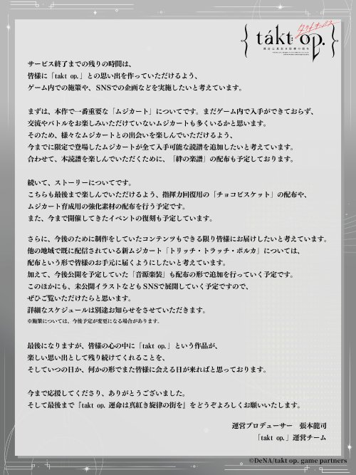2024-02-08《宿命回响》日服官方推特发文,宣布本作将于2024年4月9日停服,开发团队表示“很难持续提供让玩家满意的游戏内容”。《宿命回响》为DeNA与Bandai Namco Filmworks合作推出的跨媒体计划,除了手机游戏之