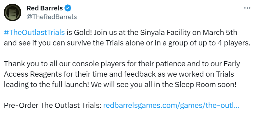 《逃生:试炼》在去年5月份于Steam平台开启了抢先测试,游戏在推出一周内就突破了50万套,目前该作的累积销量突破150万套,而官方也是宣布游戏已经进入进厂压盘阶段,预计会在3月5日正式发售。