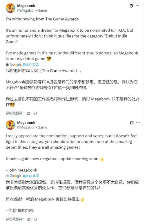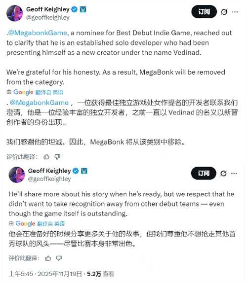 同时,TGA主持人Geoff Keighley发文表示:“《Megabonk》开发者已联系到我们并主动澄清其身份,他此前一直以Vedinad之名的新人创作者形象亮相。我们非常感谢他的坦诚。根据评审规则,《Megabonk》将退出该奖项的角逐。”