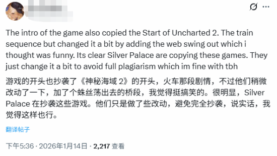 而除了这条争议外,外网还有玩家声称:另一段列车坠毁的演出与《神秘海域2》的列车演出神似: