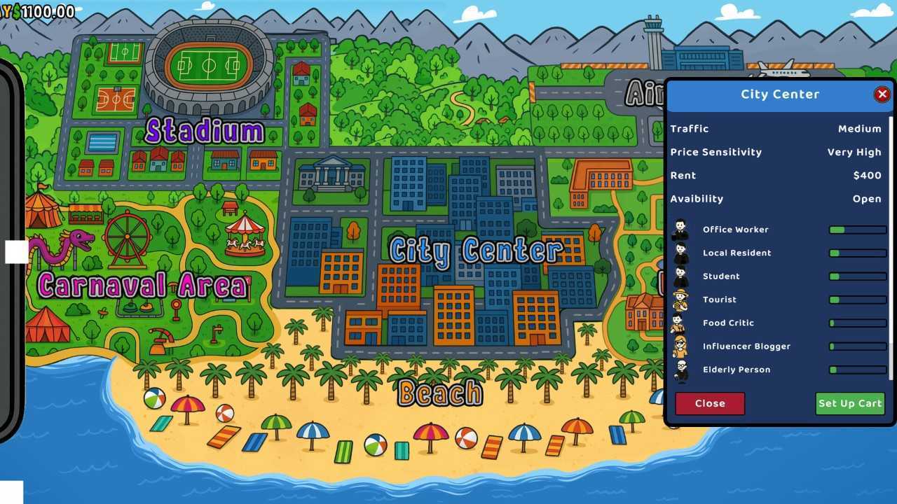 Food Cart, Inc.这游戏是让玩家开移动餐车在大城市里闯荡的,街道就是你的餐厅,得在各种地方比如城市街区,嘉年华,大学校园还有机场这些地方给顾客做吃的,得赶紧接订单,准备餐点,还得让顾客满意,一天下来得赚够钱,不然租金都付不起,赚的钱还得留着买食材和交租金,这游戏挺考验经营能力的,玩起来还行。