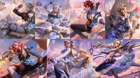 本次系列皮肤构建了一个极具艺术感的背景故事:在著名的音乐之都“维洛利亚”,伊泽瑞尔、拉克丝、凯特琳、锐雯、格温五位英雄组成了乐团,于新年音乐会共同协奏出动人的告白乐章。