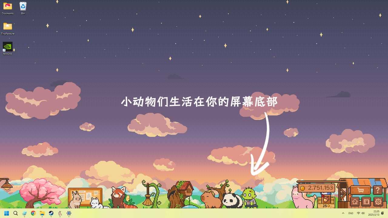 《动物栏:桌面牧场》是一款位于屏幕底端,陪伴您工作与学习的牧场放置游戏。你可以购买抚育数只小动物,收集它们成年后掉落的金币赚取利润,以扩充你的牧场。在您自我提升、休闲娱乐时,小动物也伴随着你一起成长。 兔子、狐狸、羊驼、小鸟……甚至还有史莱姆和僵尸?你可以建造多个牧场,把它们分开安置。在不久后,你将能拥有一个动物军团! 和小动物互动,不仅能让小动物成长得更快,还可以加速成年动物掉落金币的速度! 给两只同种类的小动物喂食特殊道具,过一段时间后它们将会培育出新生命! 购买并部署魔法设施,让它们协助你确保小动物的清洁与健康! 可调节游戏画面在电脑屏幕中的纵向与横向比例。 可自由选择把动物们放置在屏幕左下角或右下角。